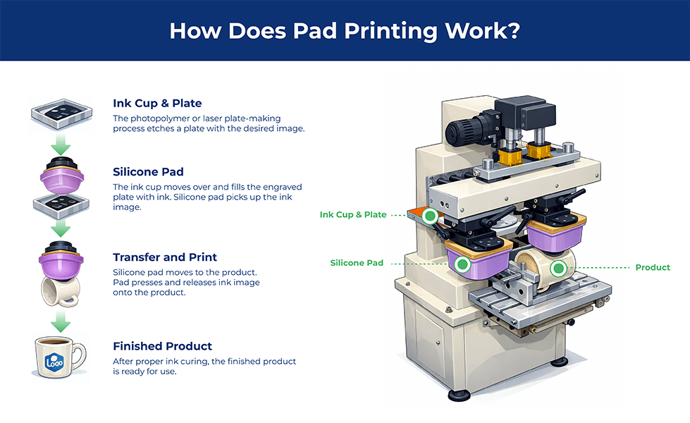 - The pad is pressed onto the plate, and the ink is transferred from the artwork onto the silicone pad. As the pad moves away from the plate, the ink cup moves over the plate again, preparing to repeat the process.